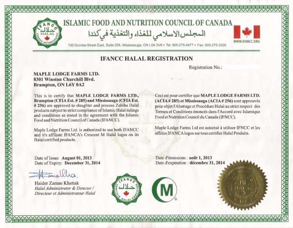 En 2007, l’Islamic Food and Nutrition Council of Canada (IFANCC) s’est incorporé au Canada anglais en tant qu’organisme à but non lucratif sous couvert de se dédier à la recherche scientifique, dans le domaine de la nourriture, de l’alimentation et de la santé, au service de l’industrie de l’alimentation et des consommateurs musulmans. C’est elle qui aujourd’hui, vend les certifications halal au Canada anglais. Depuis le 1er novembre 2013, c’est elle qui certifie la Maple Lodge Farms.
