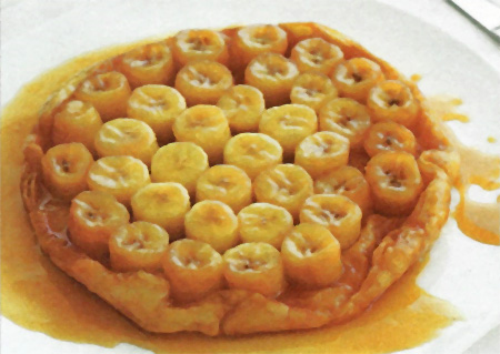 3. Disposez les rondelles de banane sur le caramel et recouvrez le tout du disque de pâte. Pressez les bord qui dépassent contre les rondelles de banane de sorte à former une bordure. Saupoudrez la pâte avec le sucre supplémentaire. Enfournez pour 15 minutes environ. Démoulez la tarte Tatin en la renversant sur une grande assiette.