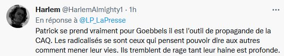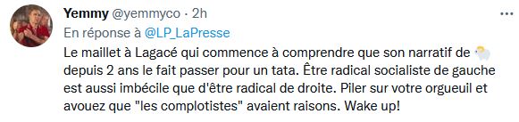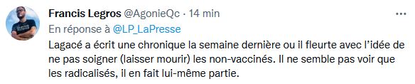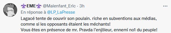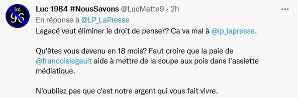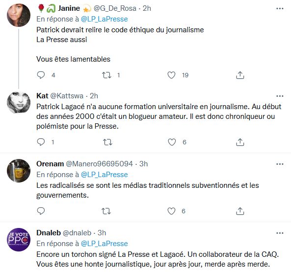 «Patrick devrait relire le code éthique du journalisme, La Presse aussi, Lagacé toujours aussi méprisant et condescendant, désinformation, Inondons La Presse de plaintes pour manque d’éthique journalistique, a quoi sert Patrick lagacé, a un sérieux problème là! Il est complètement incohérent , discours haineux, langues brunes du Québec, Patrick Lagaçé, quand un hystérique est dans sa phase extrême de délire, quand est-ce qu'on arrête Jean Charest Guy Ouellet et Patrick Lagacé ?