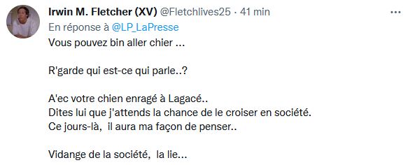 On à ici, un chroniqueux Patrick Lagacé qui porte plainte contre un individu, il évoquait le désire de lui donner une claque sur la gueule!, Question : « combien d'entre vous seriez vous près à aller jusqu'à payer pour lui donner une claque sur la gueule ?»