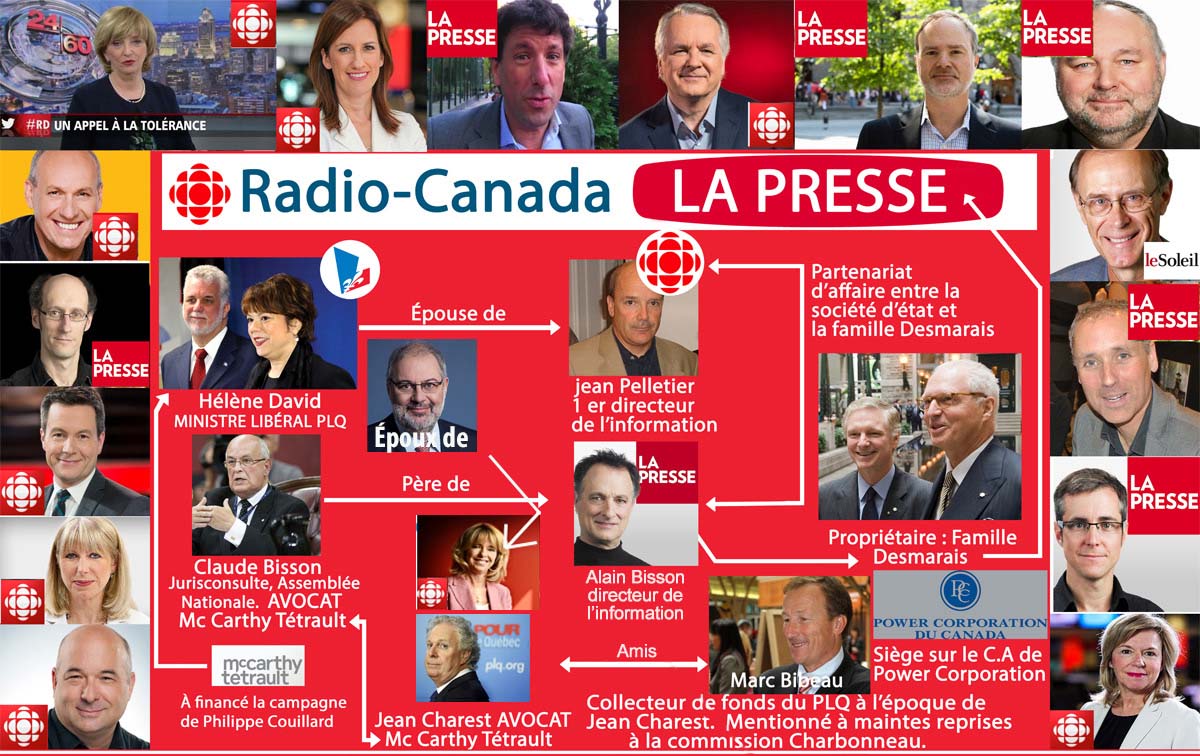 Hélène David Ministre du parti libéral du Québec est l'épouse de Jean Pelletier 1 er directeur de l'information de Radio-Canada, donc la soeur de Françoise David de Québec solidaire.  Pierre Arcand ministre libéral est le mari de Dominique Chaloult qui est directrice générale à Radio-Canada.