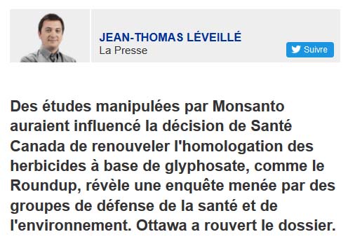Jean-Thomas La Presse Mosanto" href="https://www.lapresse.ca/actualites/sante/201811/09/01-5203695-homologation-du-glyphosate-des-etudes-frauduleuses-utilisees-par-sante-canada.php" target="_blank" rel="noopener noreferrer">Lire l'article