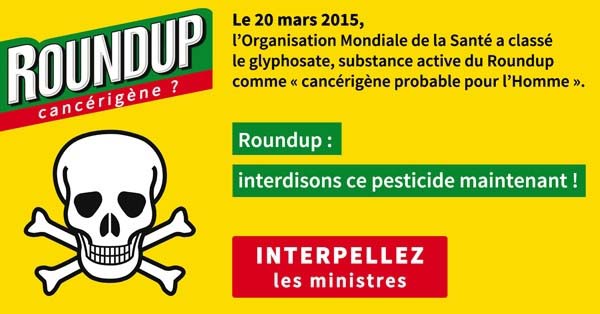 C'est quand même assez spécial qu'on retrouve un dessin, d'une main squelettique sur les contenants de Roundup, ça doit être pour dire, ce n'est pas dangereux.