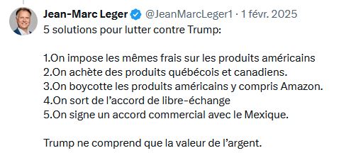 Dernièrement, Jean-Marc Leger a laissé entendre sur un poste sur le réseau social X , disant «Il a bien hâte, d'entendre les partisans du Canadien hué l'hymne national américain, c'est fini d'être gentil avec la visite quand elle vous crache dessus. Le peuple américain a choisi Trump alors qu'ils vivent avec les conséquences ! »