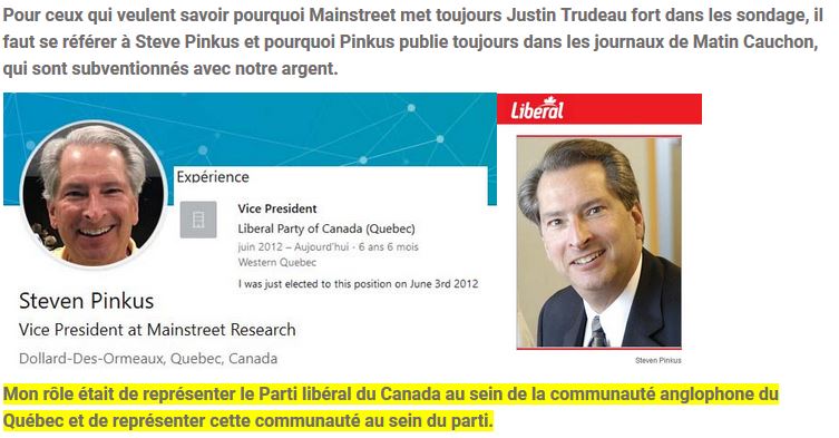 Revenons à nos moutons, le fameux sondage de Mainstreet, qui est derrière cette firme de sondage ? http://www.lesmanchettes.com/actualites/politique/64-qui-croit-encore-aux-sondages-de-mainstreet-research http://www.lesmanchettes.com/actualites/politique/65-les-sondages-au-canada-non-merci